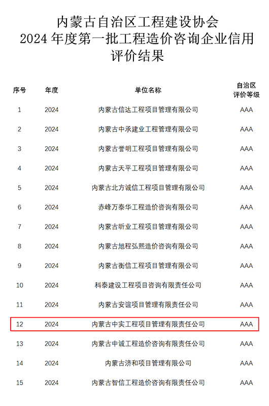 2024-07-3014459 次近期,我公司參加內蒙古自治區工程建設協會組織的“2024年度第一批工程造價咨詢企業信用”申報,獲得“信用AAA級證書”。我公司成立多年以來,遵循中國工程造價管理協會對造價咨詢企…